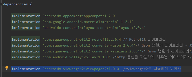 1. build.gradle(:app) -> ViewPager2를 사용하기 위한 종속성 추가.