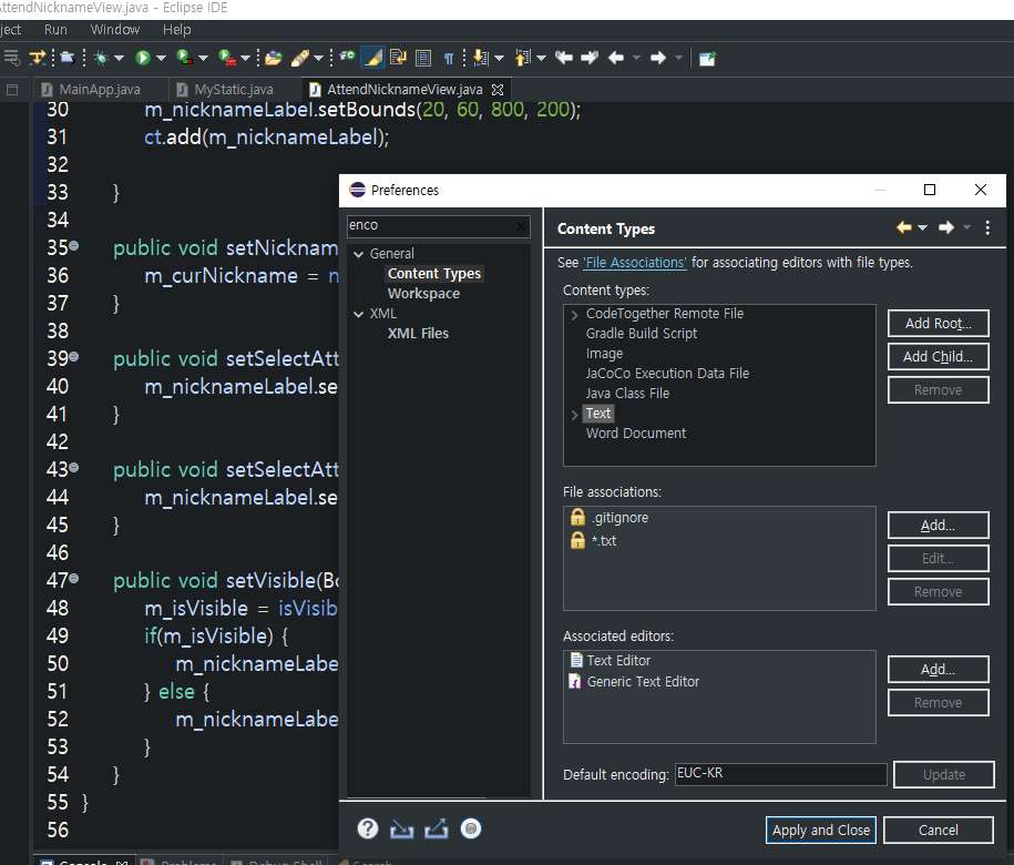 Text클릭 후 Default encoding 입력란에 EUC-KR을 입력하고 update를 클릭.