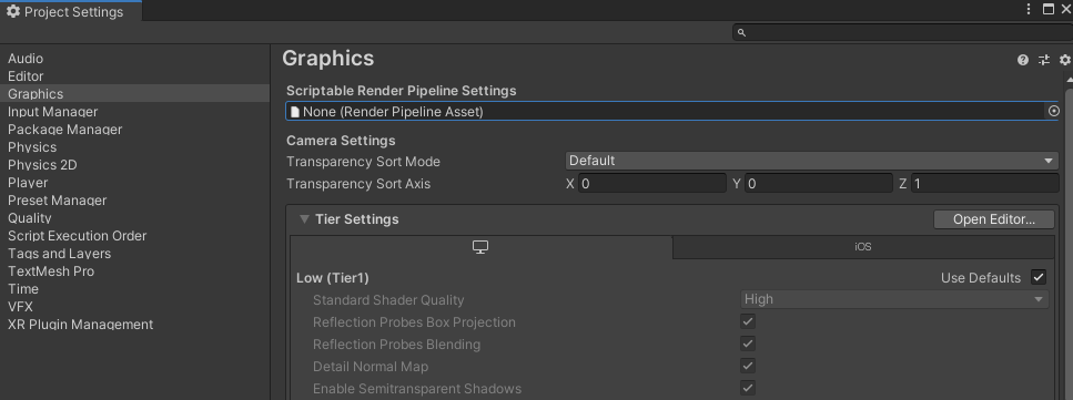 2. Project Settings -> Graphics 에서 Rander Pipeline Asset 아까 위에서 생성된 UniversalRenderPipelineAsset 넣어줌