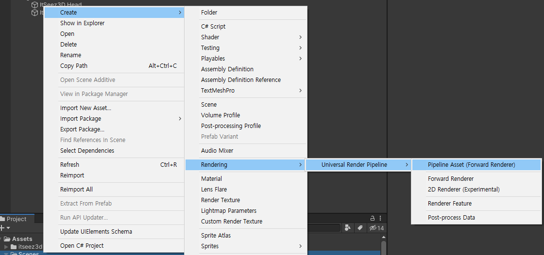 1. Project view 오른쪽 마우스 클릭 -> Create -> Rendering -> URP, HDRP.. -> Pipeline Asset클릭
