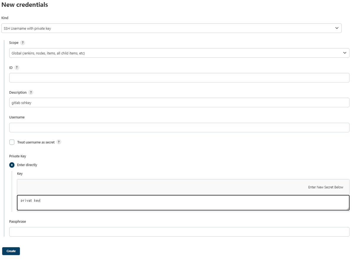 #[gitbash] cat ~/.ssh/id_rsa 입력하면 private key 확인 가능 이부분 복사 (jenkins에 붙여넣기)