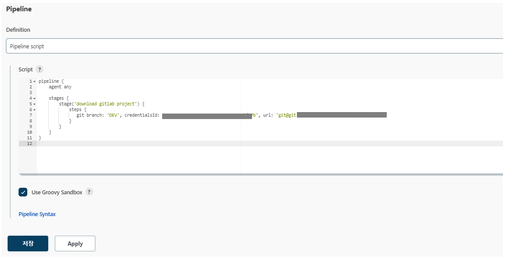 #[jenkins] 생성한 파이프라인 스크립트를 복사하여 하단 그림과 같이 붙여넣기 한 후 저장